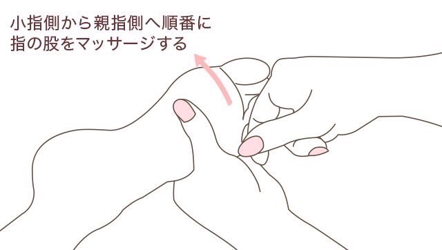 - 小指側から順番に、親指と人差し指の間まで行いましょう。